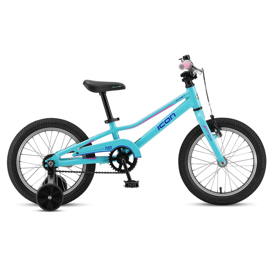 The Icon X-Lite 16" Girls Bike is a great kids' bike for ages 4-8, featuring a lightweight 6061 alloy frame that’s easy to handle. Training wheels help new riders gain confidence, while front alloy V-brakes and a rear coaster brake ensure safe stopping. This children’s bike offers a low step-through frame and ergonomic design, making it perfect for young riders learning to ride.