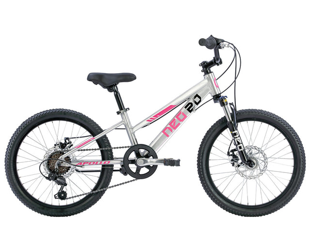 The Apollo Neo Disc+ 20 6 speed girls bike features a front suspension fork with 40mm of travel and lockout. This allows kids to switch suspension on and off, so they can transition from dirt to pavement and back again, or climb hills more efficiently.