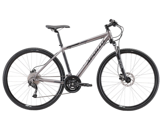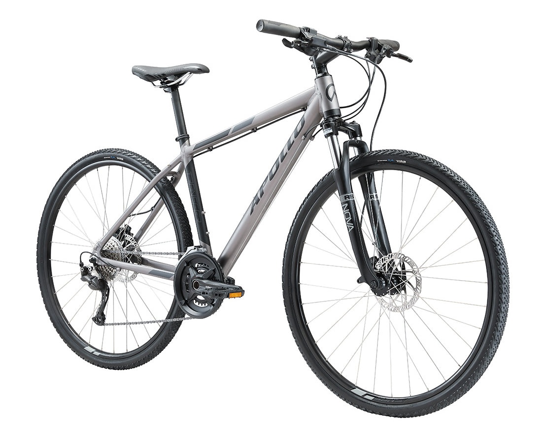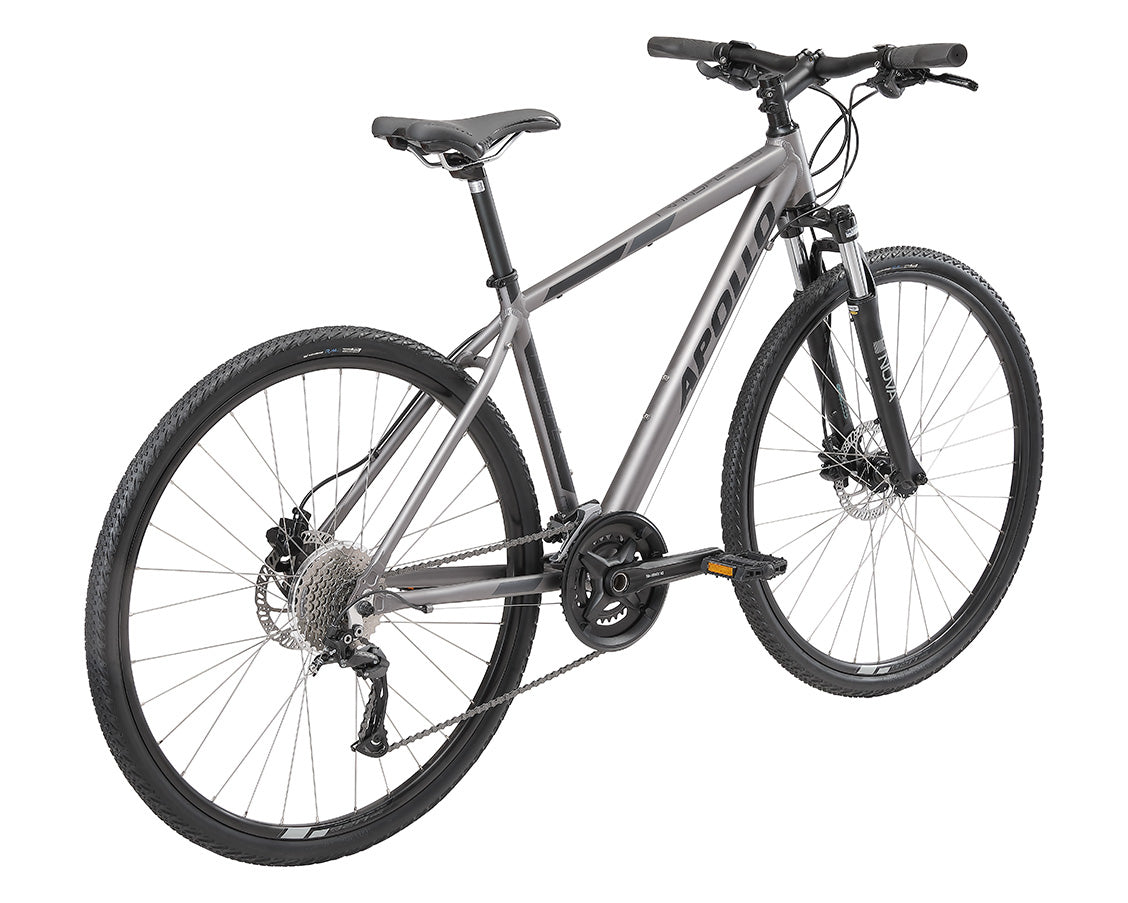 The Apollo Transfer 30 is a versatile hybrid bike designed for urban commuting and gravel tracks. Its butted 6061 aluminum frame with smooth welding ensures durability and a comfortable upright riding position. Equipped with an RST Nova ML suspension fork offering 60mm of travel and lockout functionality, it adapts well to varying terrains.