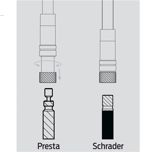 For Presta: Unscrew two parts of valve connector completely from each other. Then pull the connector out. Screw outer most piece of valve connector only onto Presta valve.