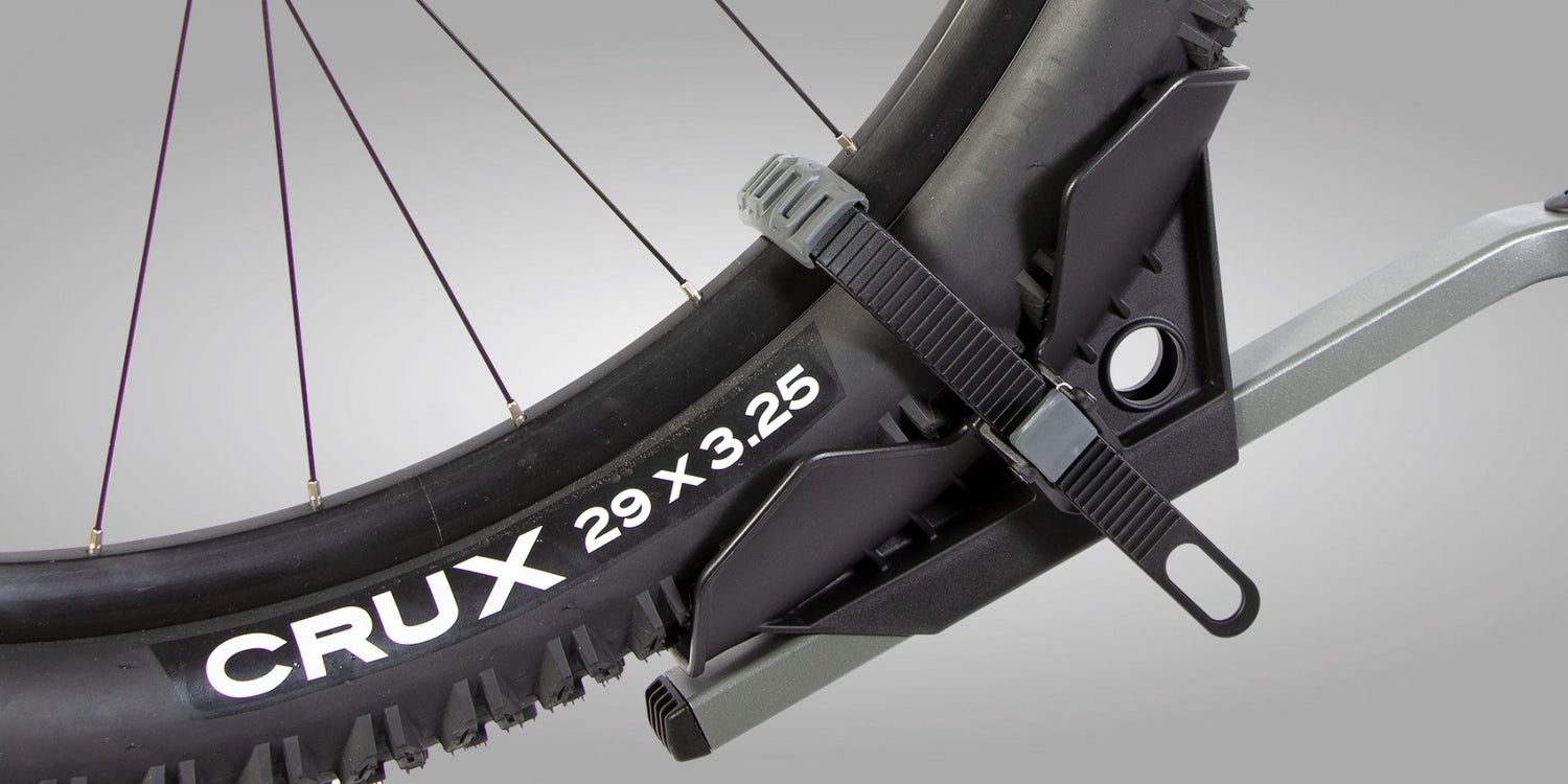 - The long wheel rubber-padded wheel straps hold tyres up to 3.25” wide; pull on them to tighten, and use the quick release to loosen