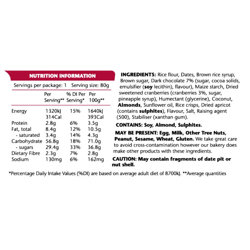 Chocolate Cranberry Craze Bar has a sweet flavour thanks to its dates, cranberries, apricots, almonds, and coconut ingredients. Made with sunflower oil and no butter, this bar is moist and easy to eat.