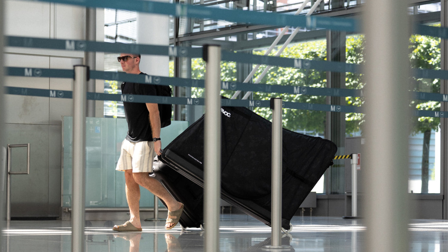 Evoc's completely new Mountain Bike Bag Pro makes transporting your mountain bike even easier, thanks to its optimized geometry—no need for time-consuming handlebar or cockpit disassembly. Simply rotate the handlebar 90 degrees by loosening the stem, and after removing the wheels and pedals, your bike is ready for transport on the adjustable BIKE STAND PRO—an especially big advantage for bikes with integrated cockpits and internally routed cables. As the lightest bike case on the market, it is now even more robust with its innovative polycarbonate base, providing reliable protection for bikes with a wheelbase of up to 130 cm during airport or train travel. Redesigned, replaceable skate wheels ensure the MOUNTAIN BIKE BAG PRO glides smoothly and quietly through airports and train stations. Evoc also updated the CLIP-ON WHEEL, repositioning it centrally under the bag for improved load distribution. When not in use, simply remove the side stabilizers, fold the case down, and store it compactly.