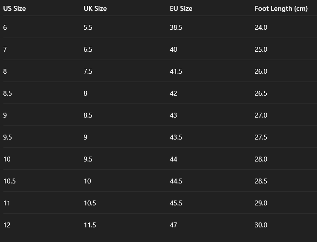 SKUsBlack/38.5: 6009699110797, Black/41.5: 6009699110810, Black/43: 6009699110834, Black/43.5: 6009699110841, Black/44.5: 6009699110865, Black/45.5: 6009699110872, Black/47: 6009699110889