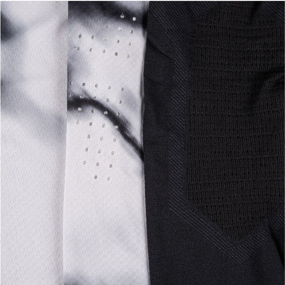 - Body is regular fit with skin fit sleeves in compression knit, giving a vest + baselayer look & feel