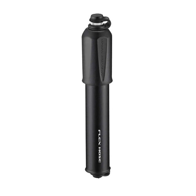 Compact pump with overlapping handle, designed for high volume tires. Machined aluminum barrel and piston, composite matrix handle and end caps. Equipped with the Flex hose; Presta and Shrader valve compatible. Includes lightweight composite matrix frame mount.