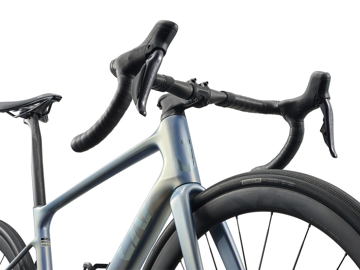 The Liv Contact D-Fuse handlebar features an ergonomic shape and 8-degree flare drop, for total control on those all-day rides. Wide, hookless carbon rims are designed for high-volume tubeless tyres (up to 38mm) and a 36mm rim depth, providing predictable handling and stability from asphalt to pavé.