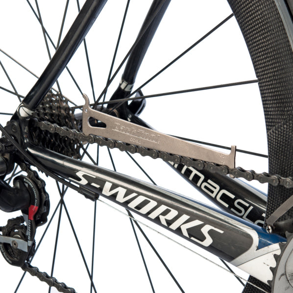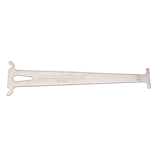 A worn bicycle chain can cause poor shifting and in time can even cause excessive wear to the derailleur and rear cogs, causing a much more expensive problem. That's why bike component manufacturers recommend chain replacement at regular wear intervals. The Park Tool CC-3.2 is a go/no-go gauge designed to accurately indicate when a chain reaches 0.5% and 0.75% wear (or "stretch"), the points at which most chain manufacturers suggest replacement. The CC-3.2 is long, accurate, and features permanent measurement markings. The CC-3.2 works on most derailleur chains* from 5 to 12-speed.