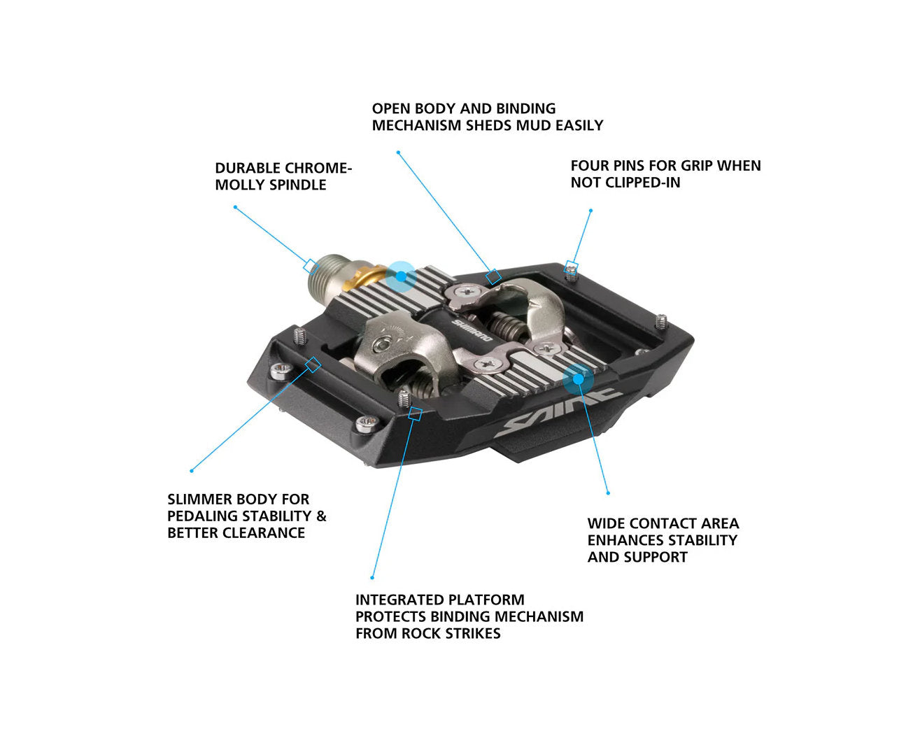 The Shimano PD-M821 Saint SPD pedals are purpose-built for downhill and enduro riders who demand maximum stability, bike control, and durability. Featuring a wide platform, slim body, and adjustable pins, they provide confidence and grip on the roughest terrain, even when unclipped.