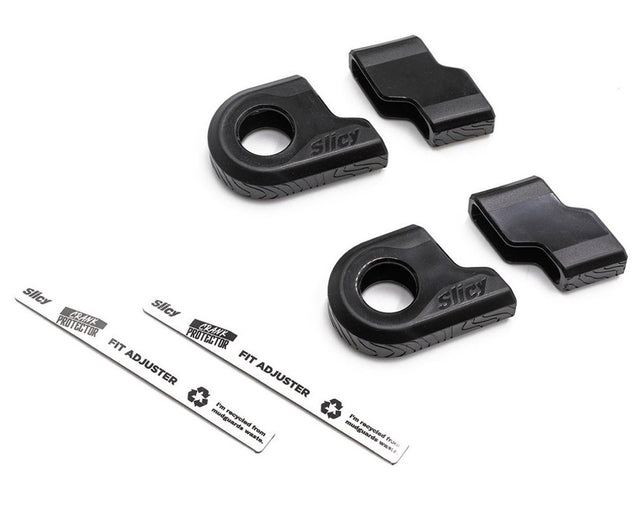 Protect your crankarms from rock strikes, impacts and scuffs with this simple, effective 2-piece crank protection system. Designed to suit most carbon and aluminium cranks, it includes a 1 mm recycled mudguard shim for a snug, rattle-free fit when needed. Once installed, the Slicy crank protector stays firmly in place, adding durability and clean style to your drivetrain.