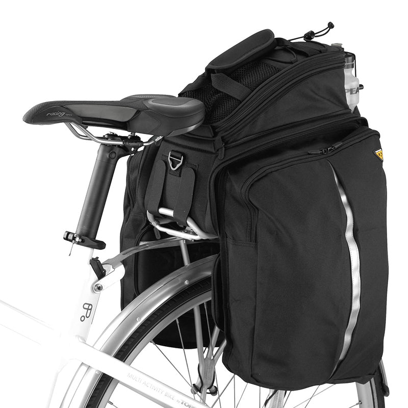 Dual molded side panels combine with flexible 600 denier fabric to form a semi-rigid, weather resistant trunkbag. Divided main compartment and side panels expand for extra storage capacity. Rear water bottle holder lets you carry more water on extended trips. Attaches to a rack with straps.