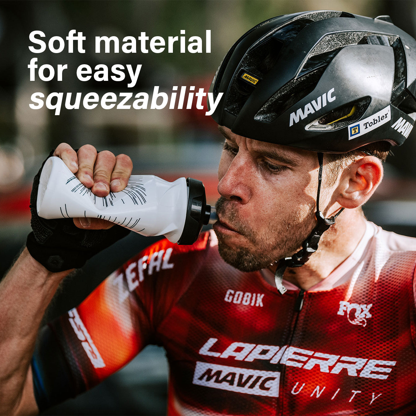 Thanks to the experience we've gained from everyday use and competition, our R&D team has come up with a uniquely designed water bottle that offers easy squeezability thanks to its soft material. With a remarkable grip, it allows a high water flow with a minimum of effort.